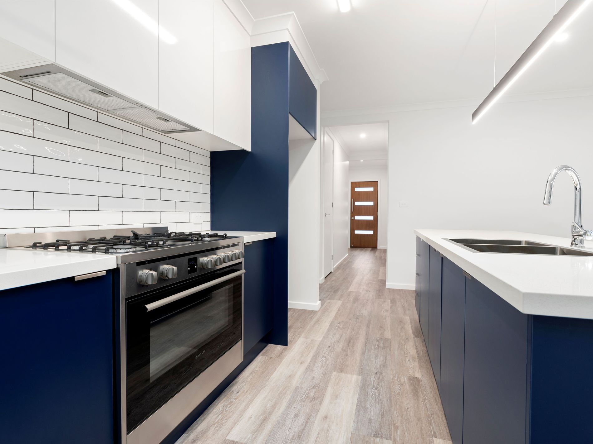 - Stylish and functional kitchen with bold colour accents, stone benchtops, 900mm freestanding oven, dishwasher, walk-in pantry and island bench,