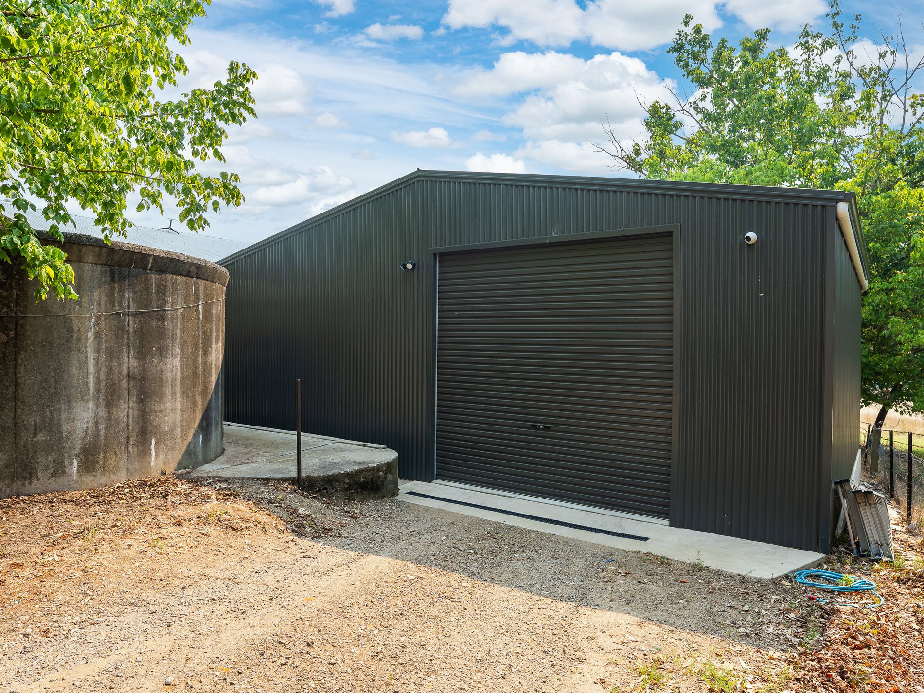 • Large lockable shed suitable for vehicles, complete with workbenches, lighting, and ample storage