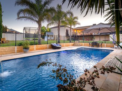 - Large enough to host an entire family and additional friends, the pool is finished beautifully with sandstone pavers, water feature and umbrella. The pump and filter are recent improvements and there are provisions for solar if you would like to extend your swimming season.